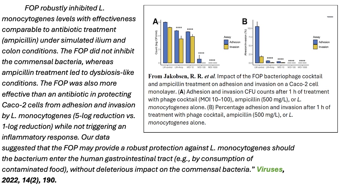 4. Jakobsen, R. R. et al. (2022). "A bacteriophage cocktail significantly reduces Listeria monocytogenes without deleterious impact on the commensal gut microbiota under simulated gastrointestinal conditions." Viruses 14(2).